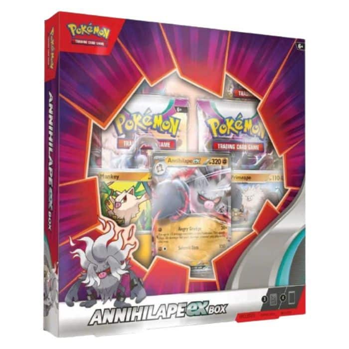 El daño solo hace que este poderoso Pokémon ex se vuelva más fuerte, y está acompañado por Mankey y Primeape para ayudarte a ponerlo en juego de inmediato. La caja de Pokémon TCG: Annihilape ex