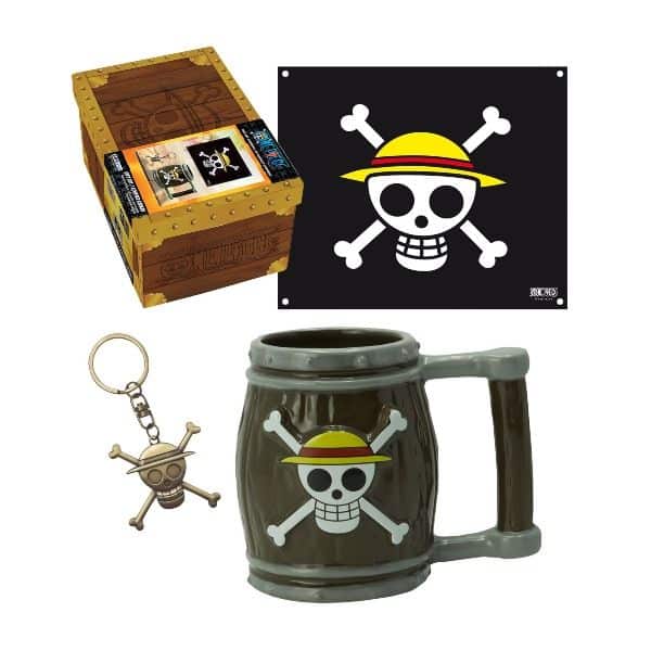 En este caso estamos ante un set de One Piece que ¡menuda pasada! Por fuera ya es como para no abrirla, caja imitando cofre que además incluye bandera, barril y llavero del anime.