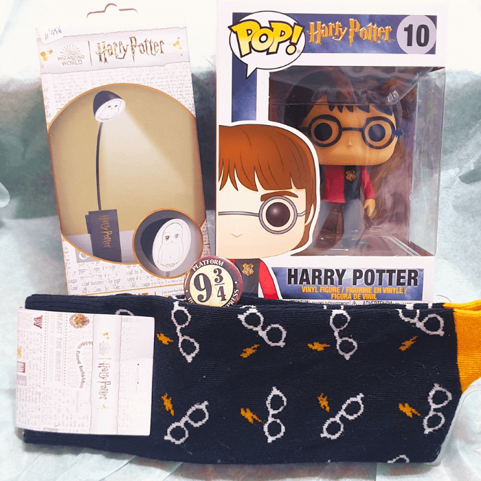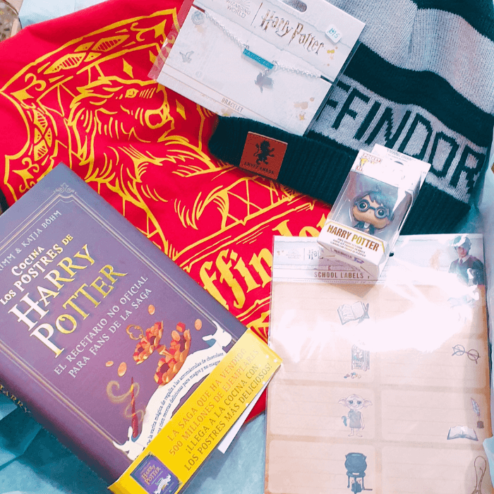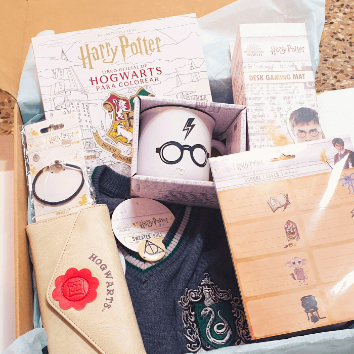 Una caja llena de regalos y sorpresas temáticas de Harry Potter.