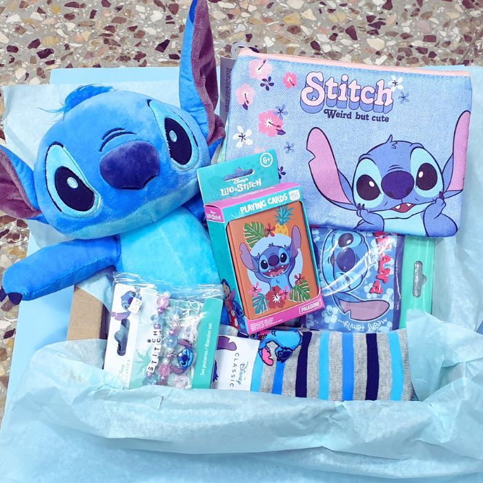 Una caja llena de regalos y sorpresas temáticas de Lilo y Stitch.