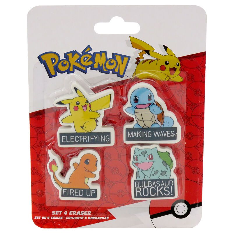 - El contenido del set es: 1 goma de Pikachu, 1 goma de Squirtle, 1 goma de Charmander y 1 goma de Bulbasaur.